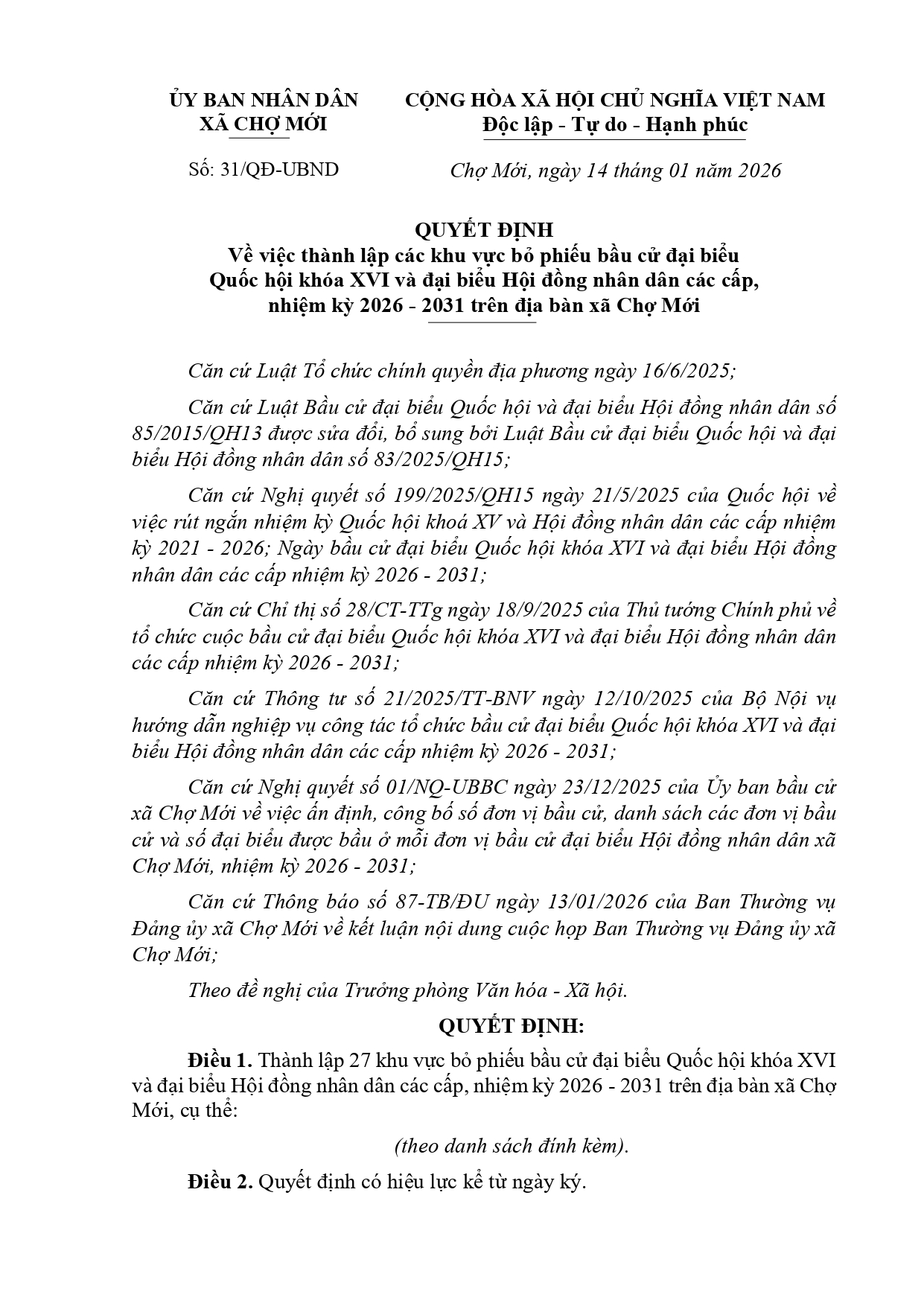Thực hiện Nghị định số 06/2026/NĐ-CP ngày 10/01/2026 của Chính phủ Quy định về tổ chức và hoạt động của Ngân hàng Chính sách xã hội. Ngày 27/02/2026, Chủ tịch Ủy ban nhân dân xã Chợ Mới ban hành Quyết định số 282/QĐ-UBND, Quyết định thành lập Ban Đại diện Hội đồng quản trị Ngân hàng Chính sách xã hội xã Chợ Mới.
