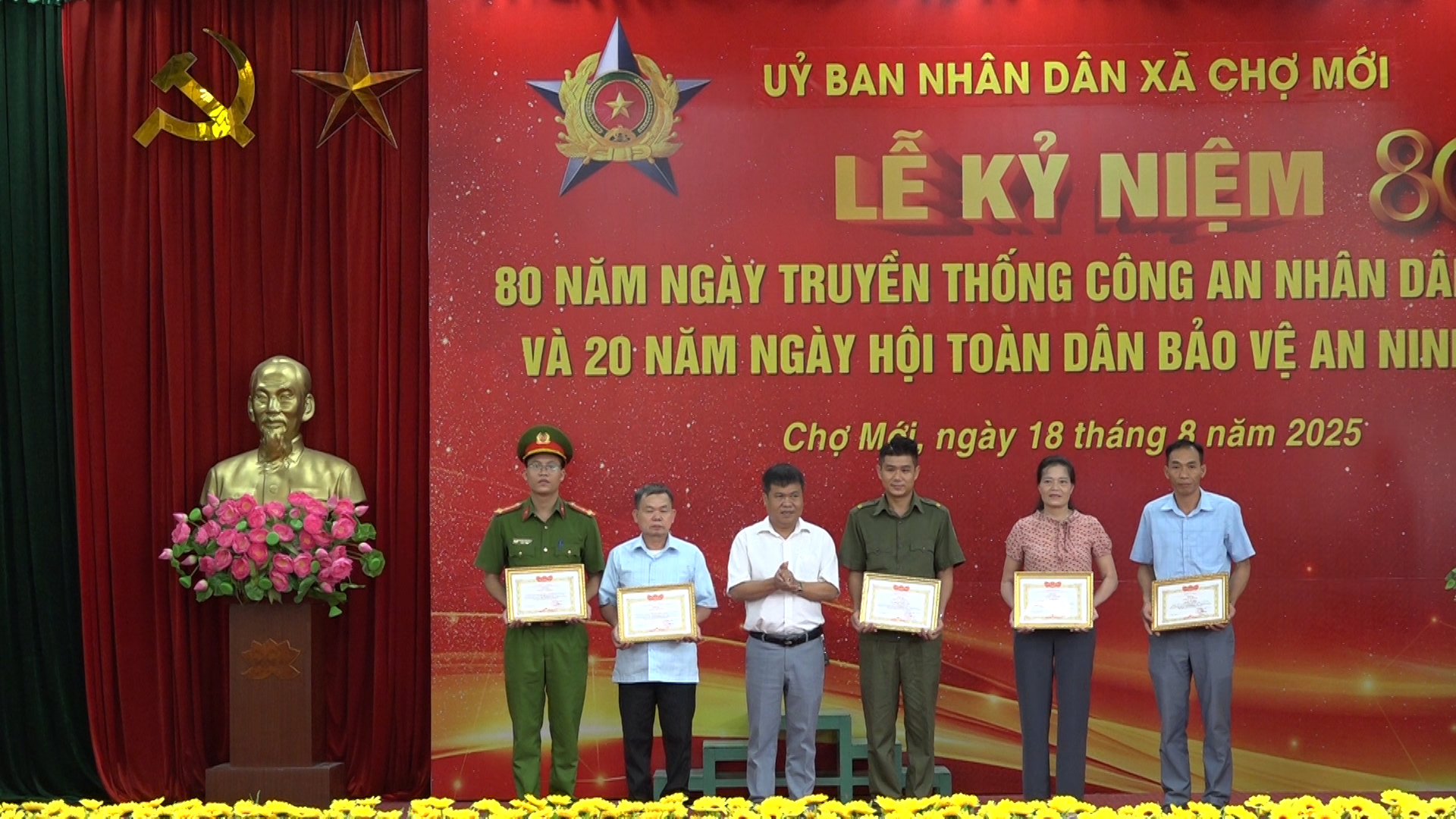 Sáng 18/8, xã Chợ Mới tổ chức Lễ kỷ niệm 80 năm Ngày truyền thống Công an Nhân dân Việt Nam (19/8/1945 – 19/8/2025) và 20 năm Ngày hội toàn dân bảo vệ an ninh Tổ quốc (19/8/2005 – 19/8/2025). Dự buổi lễ có đồng chí Triệu Tiến Trình, Bí thư Đảng uỷ xã; đồng chí Trần Mạnh Cường, Phó Bí thư Đảng uỷ, Chủ tịch UBND xã; các đồng chí trong Ban Thường vụ Đảng uỷ, lãnh đạo UBND xã cùng đại diện các ban, ngành, đoàn thể và lực lượng Công an xã, lực lượng tham gia bảo vệ an ninh, trật tự ở cơ sở.